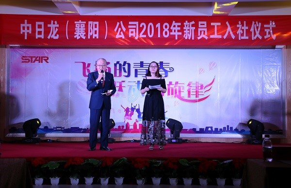 2018年7月3日下午3点10分,我司在食堂二楼大厅举行了2018年新员工入社仪式,日本星精机株式会社盐谷国明社长、日本国盛化学株式会社盐谷阳一社长、日本星精机株式会社平出金治常务取缔役、日本星技术株